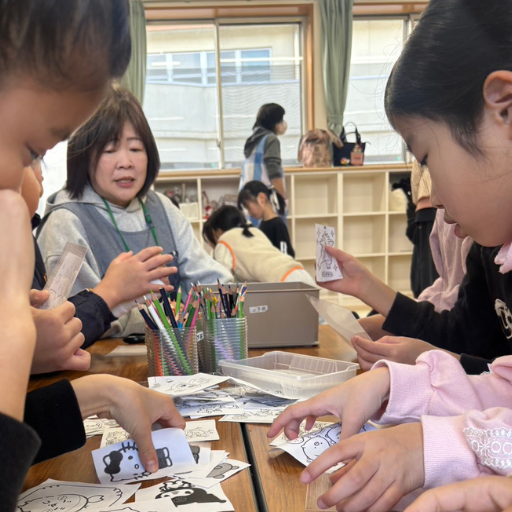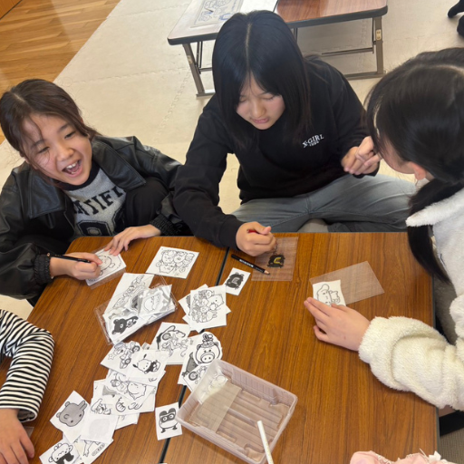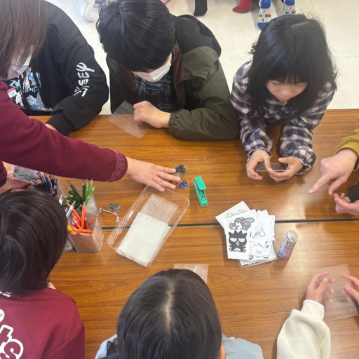 思い思いにプラスチックのシートに絵を描いてトースターで焼くと、5分のⅠ位に小さく、同時に堅くなり可愛いチャームが出来上がります。絵は、好きなキャラクターを写したり、自分で考えて描いたり楽しい時間でした。穴にボールチェーンを通して早速カバンに取り付けていました。